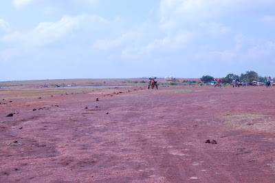 As soon as we got out of the car, a man approached us and told us about the "horse cart" ride. We looked at the rates and agreed to Rs.320 for an hour, featuring 15 points over the Tableland. As is, the tableland is 6 kms wide, so walking was out of question. Anaya woke up just as we got into the horse cart. She liked the cart and as soon as the cart moved, she was happy. She first said "hamma" to the horse, just because she saw it from behind. Then, she wanted to not sit on the lap, but stand in the space between. The main tableland is the biggest of the five. The horse cart driver identified the other four to us. The cart was bumping too much, much to the delight of Anaya. There was a crowd of school children out for a picnic. They were loaded in one cart which was following us. On our way, we saw the "footprints" of the Pandavas.